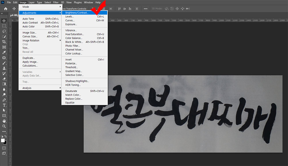 - 상단 메뉴 Image>Ajustment>Brightness/Contrast 로 들어갑니다.
