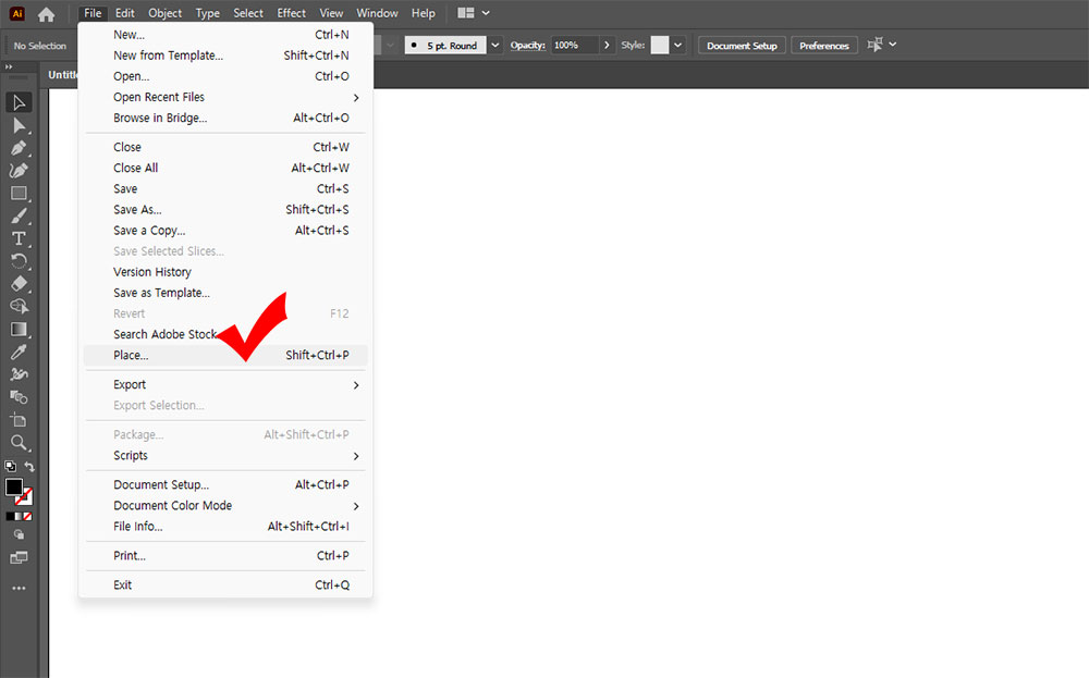 - 포토샵에서 jpg 파일로 저장했던 이미지파일을 File>Place 메뉴로 불러옵니다.