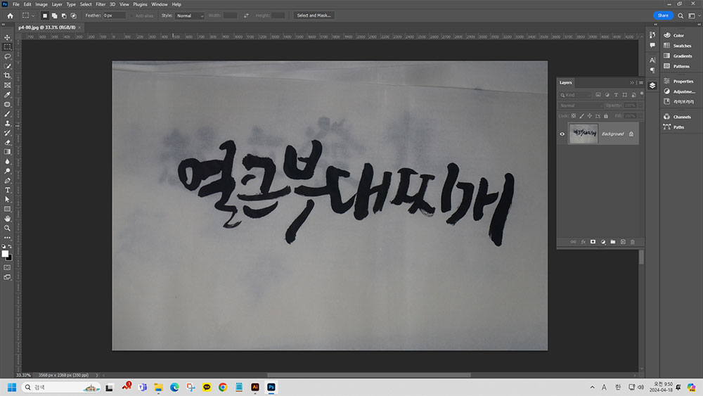 - 위 이미지처럼 먹물로 쓴 붓글씨를 사진으로 촬영하면 아마도 이런 모습이 대부분일 것입니다. 그래픽을 다루는 디자이너의 입장에서 저런 이미지를 깔끔하게 추출하여 일러스트레이터에서 활용하면 좋을 것 같습니다.